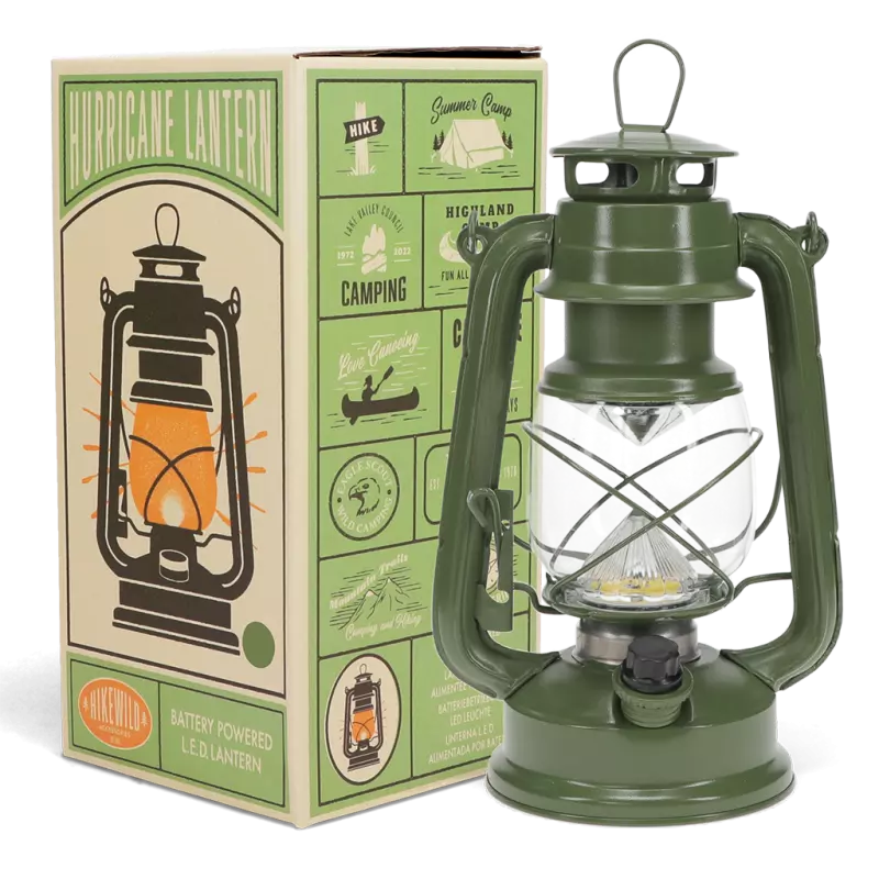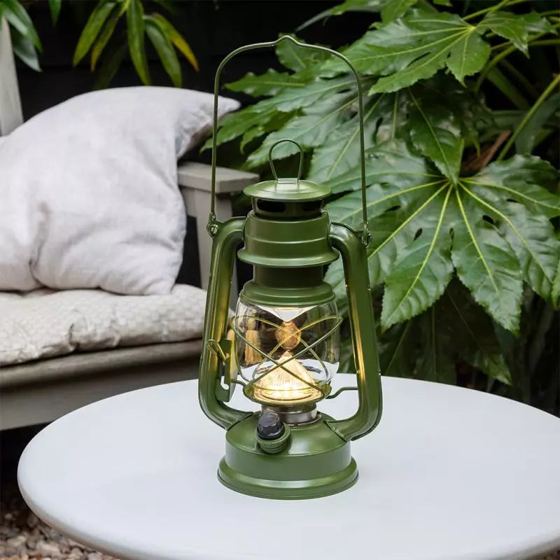 Light up any outdoor space with this retro style lantern in green. No lamp oil is required, simply add batteries for a warm, flicker-free glow. Perfect for camping trips, garden decor or patio gatherings at home.